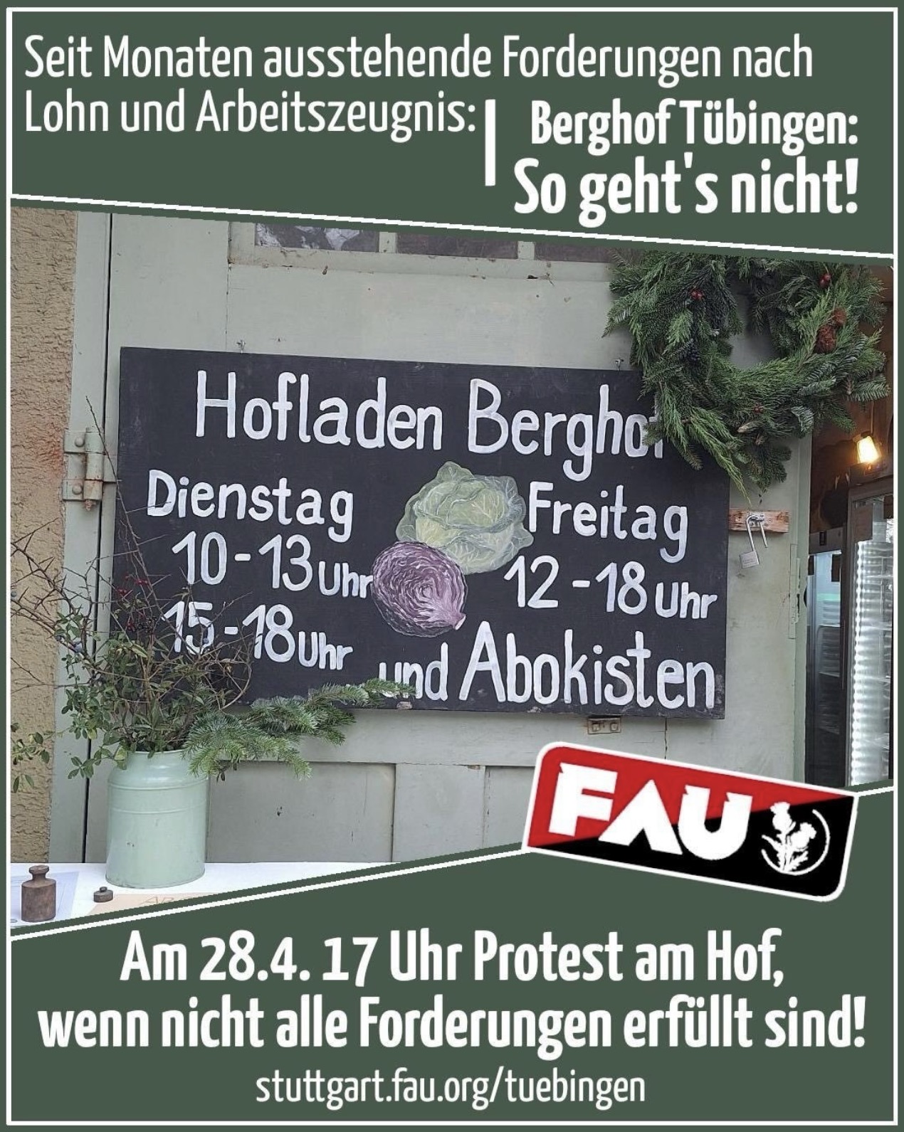 Seit Monaten bittet unser Mitglied wiederholt um verschiedene Dokumente wie Lohnabrechnungen und Arbeitszeugnisse und um den Lohn für Februar. Doch der Chef ist unerreichbar und antwortet nicht. Das ist nicht hinnehmbar. Auch Arbeiterinnen und Arbeiter haben Rechte! Kommt zahlreich um den Chef zu zwingen, seinen Pflichten nachzukommen!
